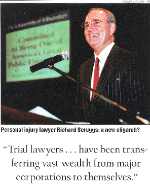 | Something similar is happening in the United States. Trial lawyers who have been targeting major industries have been transferring vast wealth from major corporations to themselves. The prime example is the series of lawsuits filed by the states against the big tobacco companies. Enormous sums have been transferred from smokers, a downscale group, and tobacco companies, owned by many Americans through pension and mutual funds, to state governments and trial lawyers. Last December an arbitration panel awarded $8.2 billion to trial lawyers representing the four states that were not part of the national tobacco settlement, to be taken out of the $34.4 billion awarded the four states. Recipients include Mississippi lawyer Richard Scruggs, brother-in-law of Sen. Trent Lott. Fees have not been settled for the other 46 states, but it is clear that the tobacco cases will produce several dozen trial lawyers with the net worth -- and potential political leverage -- of Ross Perot or Steve Forbes. | ![]() |
